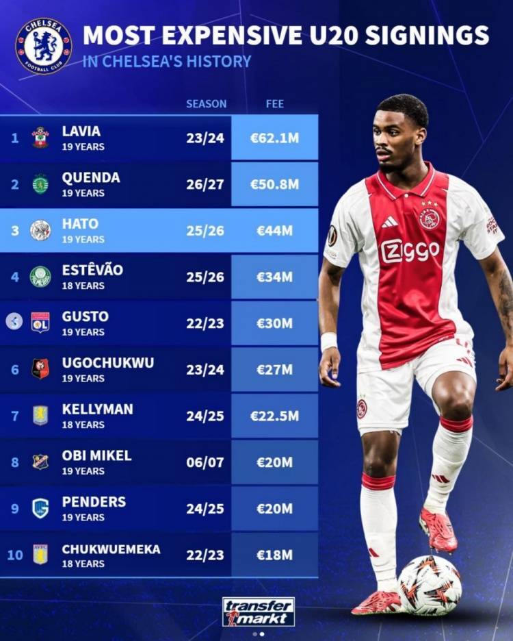 直播吧8月4日讯 德转盘点了切尔西队史在引进U20球员上花费榜,其中新援哈托第三,拉维亚居首,具体如下: